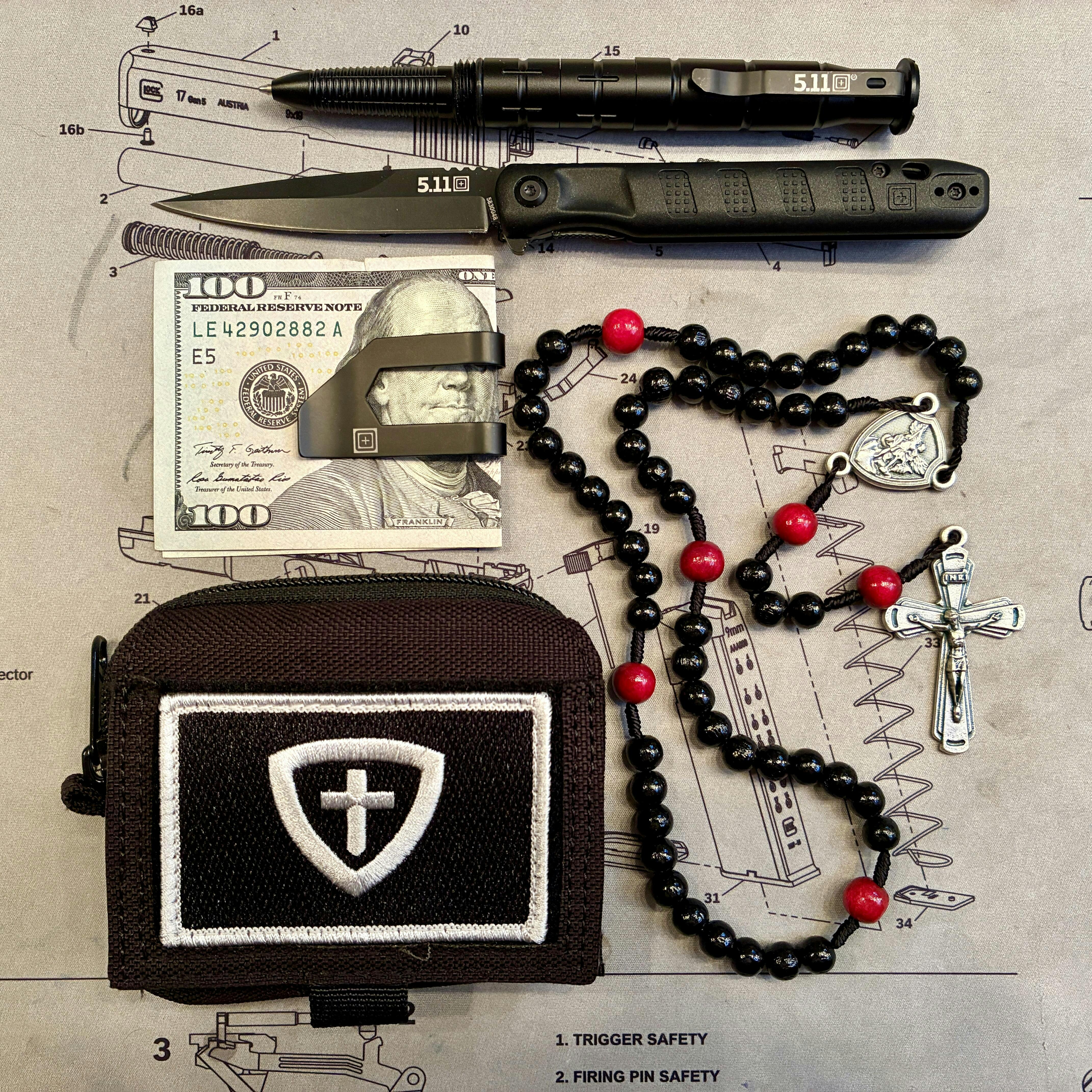 Keep your rosary protected and ready for prayer wherever you go with this durable canvas utility pouch. Made from heavy-duty black fabric with secure zipper closure, it features a hook-and-loop patch displaying our signature TCW shield emblem and MOLLE-style straps for easy attachment to bags or belts.