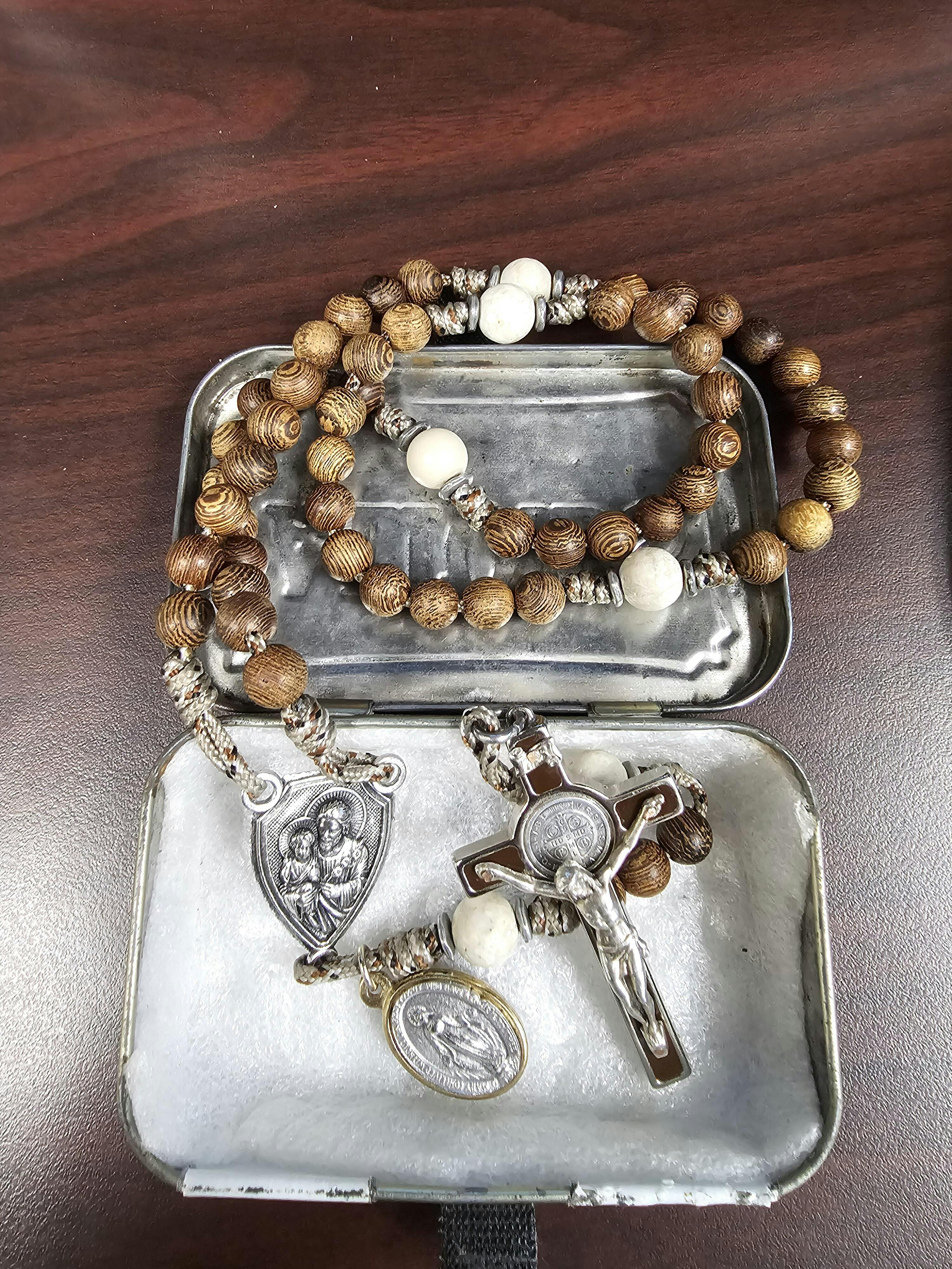 The Carpenter’s Son Rosary tells a story in metal and wood. St. Joseph stands at the center, holding Jesus, protecting Him, forming Him in love and labor. Flip the centerpiece and you see his chaste heart, wrapped in a lily and a flame, capturing the purity and passion of a father’s devotion. Surrounded by natural materials and rugged construction, this rosary reminds you to pray with the same quiet resolve Joseph showed every day. It's a quiet kind of strength, meant for those who build, provide, and keep showing up.
