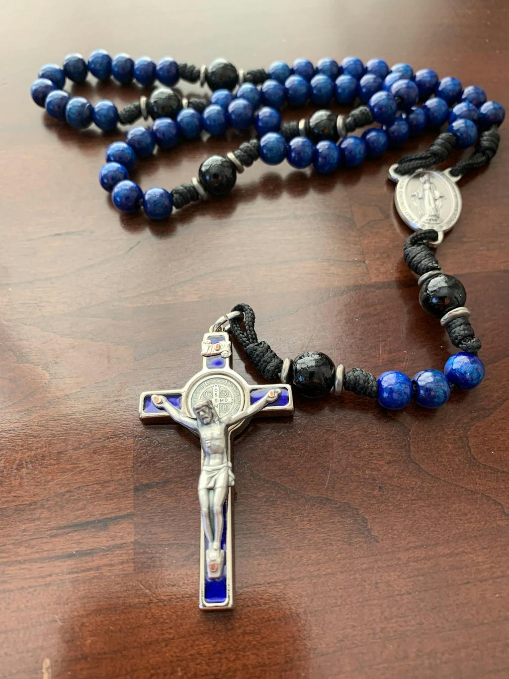 "Stella Maris" is Latin for Star of the Sea, one of Mary's many titles. It's one of my favorites because this title is often captured in paintings as a shining light guiding ships through terrifying storms at sea. The dark, blue and black gloss beads are in stark contrast with the silver color Miraculous Medal centerpiece designed to anchor you through life's storms. This rosary is built for men who navigate the everyday currents of being a leader, father or husband. Its robust features and solid construction ensure it’s ready for daily use.